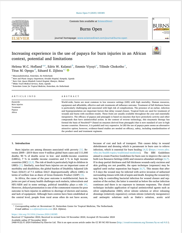 Hofland HWC, Opegu TM, Kalanzi EW, Viyuyi E, Chikoto T, Zijlstra EE. Increasing experience in the use of papaya for burn injuries in an African context, potential and limitations. Burns Open 9 (2025) 100385